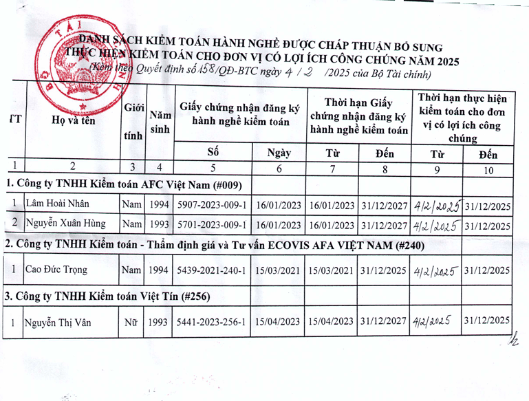 Ngày 04/02/2025 , Theo Quyết định số 158/QĐ-BTC về việc bổ sung kiểm toán viên hành nghề được kiểm toán cho đơn vị có lợi ích công chúng năm 2025